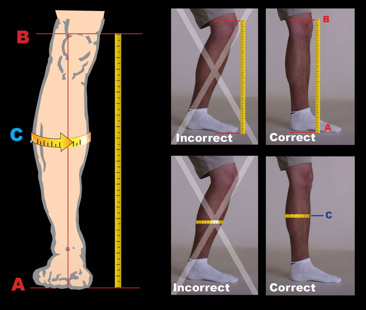 Measure around widest part of your calf muscle (c) with work pants on.