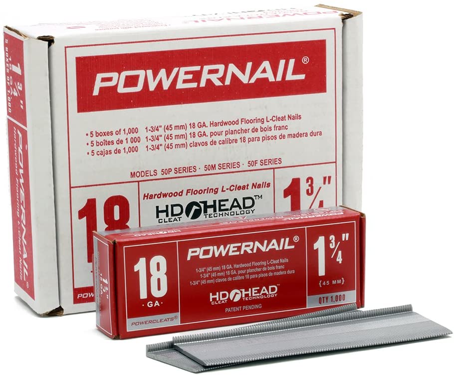 - 18-gauge, 1-3/4" long, L-shaped floor nail (also called Cleat Nail or PowerCleat), This carton contains 5000 nails.